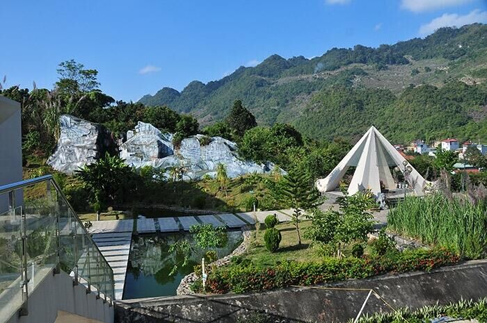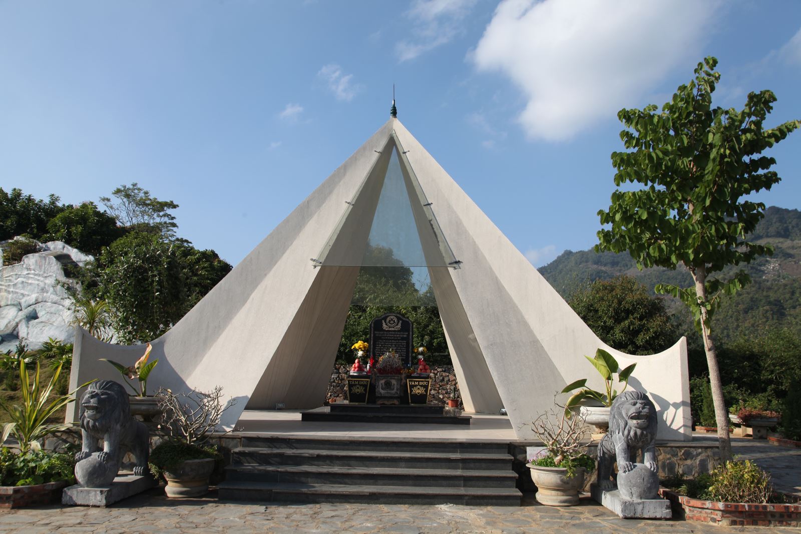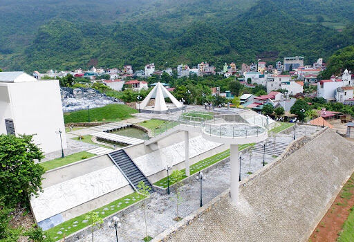 In front of the Memorial Monument is the Memory Courtyard and Reflection Pavilion, uniquely designed with transparent glass walls that open up a panoramic view. From here, visitors can admire the dreamy, mysterious beauty of the Northwest mountains and the full scenery of Mộc Châu Town.