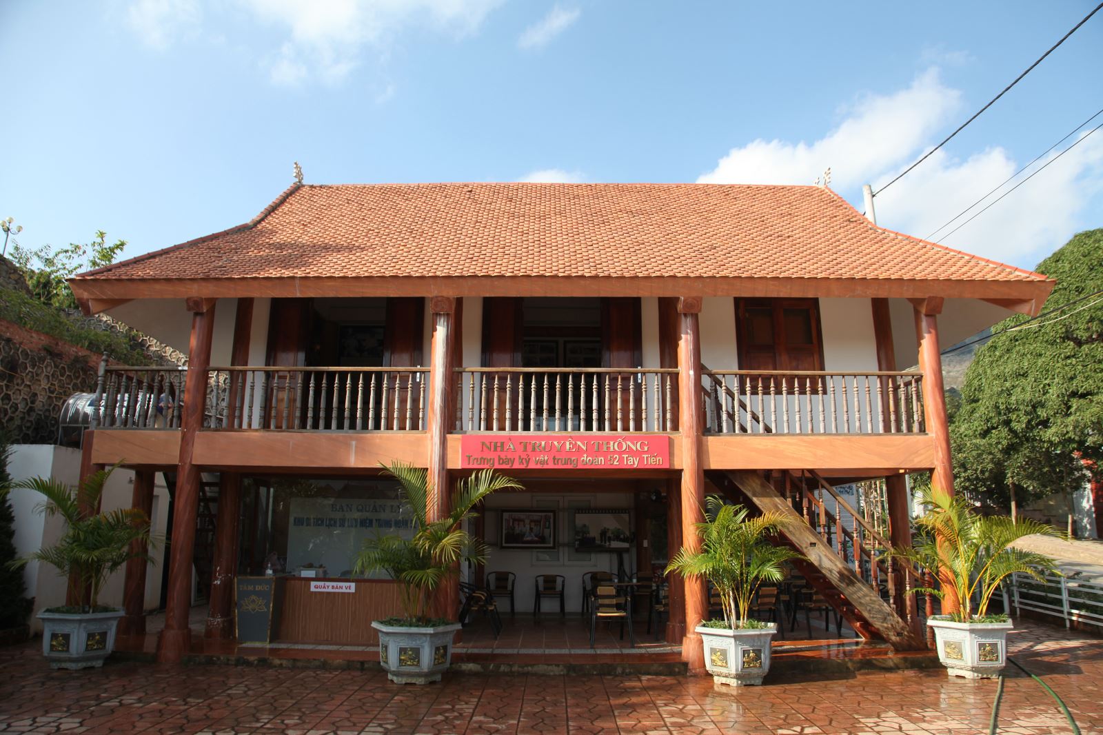 Theo sự hướng dẫn, điểm đến đầu tiên đối với du khách là Nhà truyền thống được thiết kế theo kiểu nhà sàn dân tộc Tây Bắc. Không gian trưng bày chia thành 3 phần: Không gian Đại tướng Võ Nguyên Giáp; “Tây Tiến một thời và mãi mãi” giới thiệu hình ảnh và các kỷ vật của Trung đoàn Tây Tiến xưa và nay tiêu biểu như đèn, áo trấn thủ, giấy chứng minh của nhà thơ Quang Dũng; “Tây Tiến hào hùng và tài hoa”, là không gian tái hiện lại hình ảnh của người lính Tây Tiến năm xưa, tiêu biểu là những sáng tác trong những năm tháng kháng chiến gian khổ với nhiều tác phẩm sống mãi với thời gian: Bức tranh “Nuôi giấu thương binh” của họa sỹ Quang Thọ; chân dung nhạc sỹ Doãn Quang Thái tác giả của các khúc “Vì nhân dân quên mình”; tượng bán thân của nhà thơ Quang Dũng cùng bài thơ “Tây Tiến”…