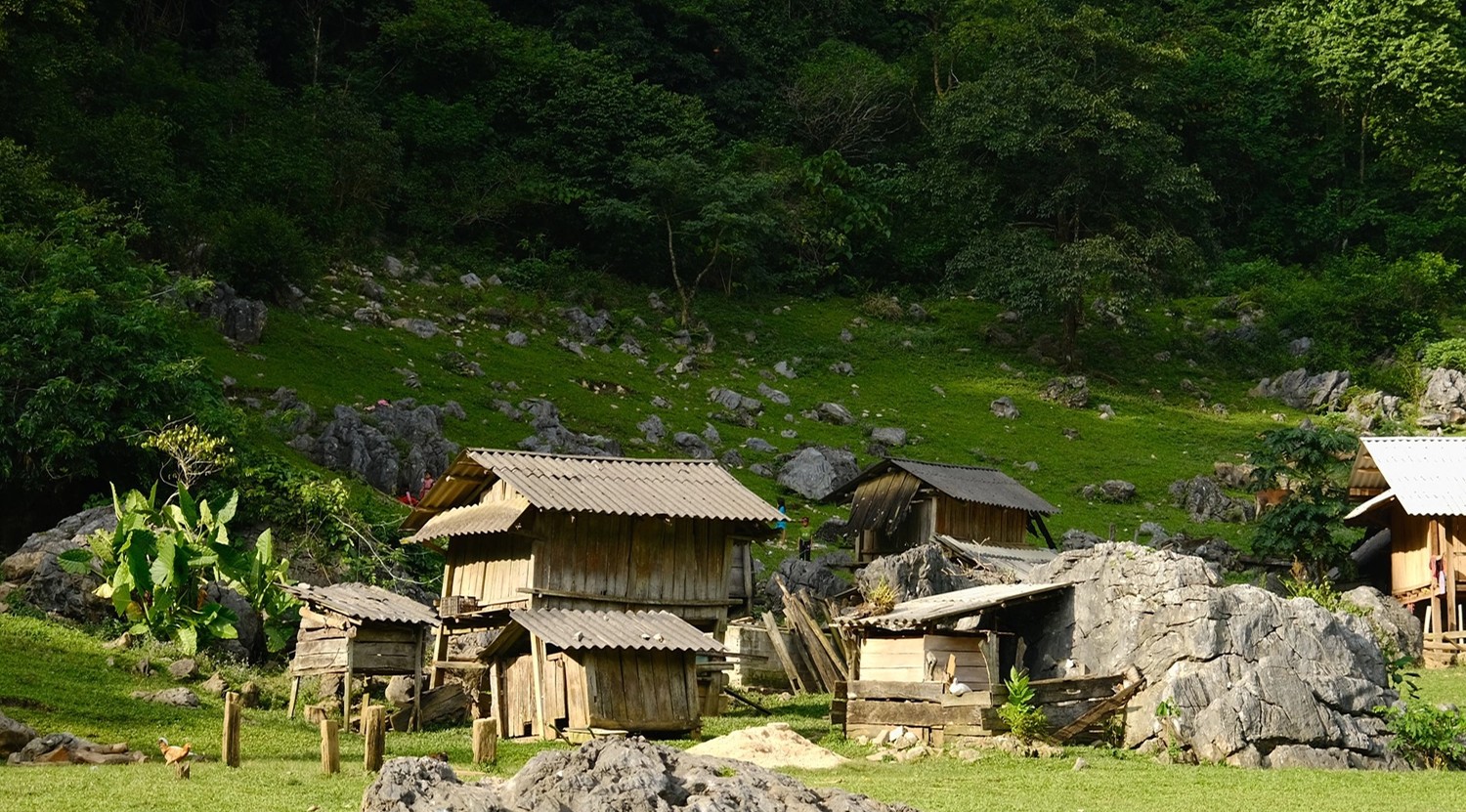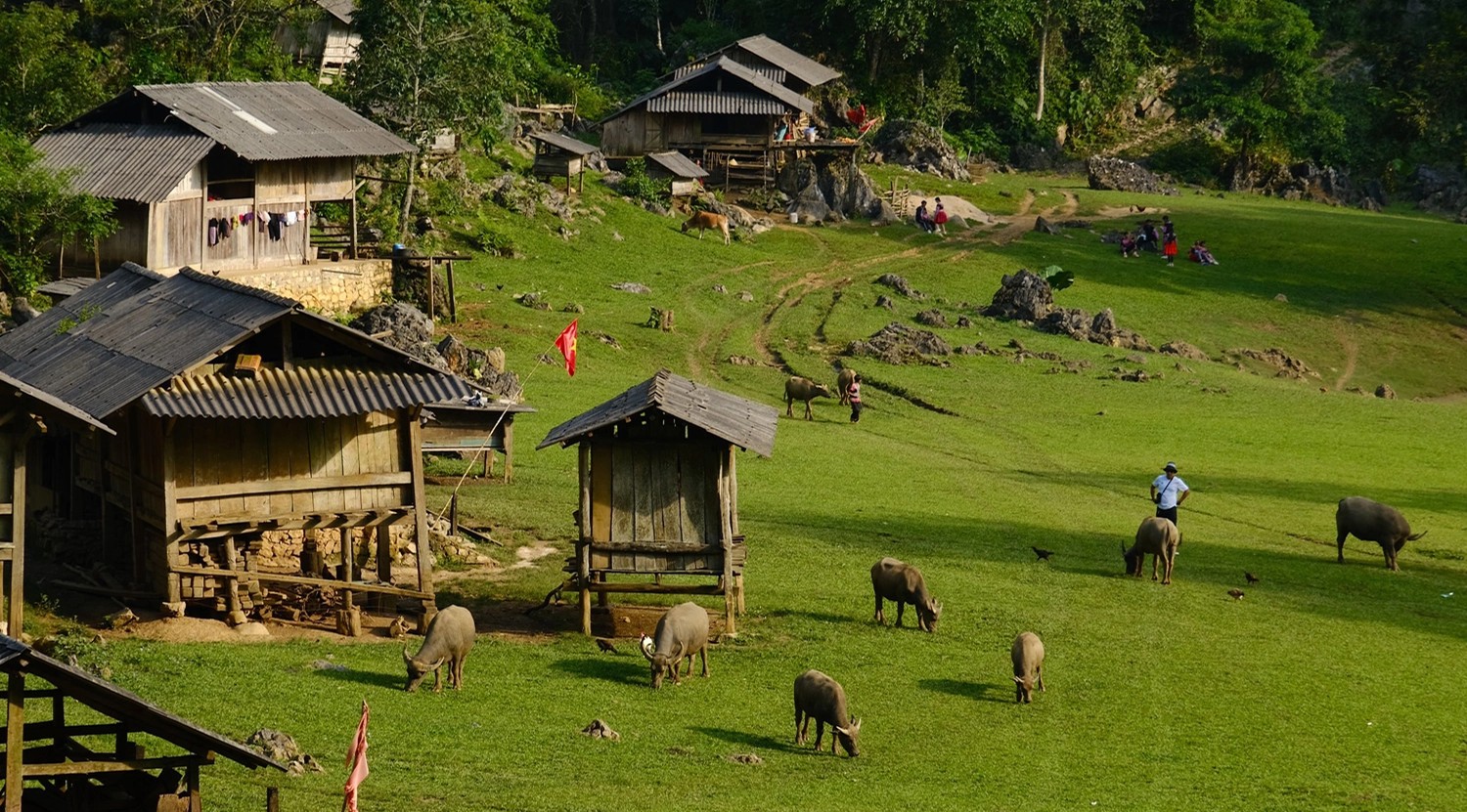 Kiến trúc mộc mạc: Những ngôi nhà gỗ nhỏ (nhà trệt) đặc trưng của người Hmong nằm rải rác bên cánh đồng cỏ xanh rì.